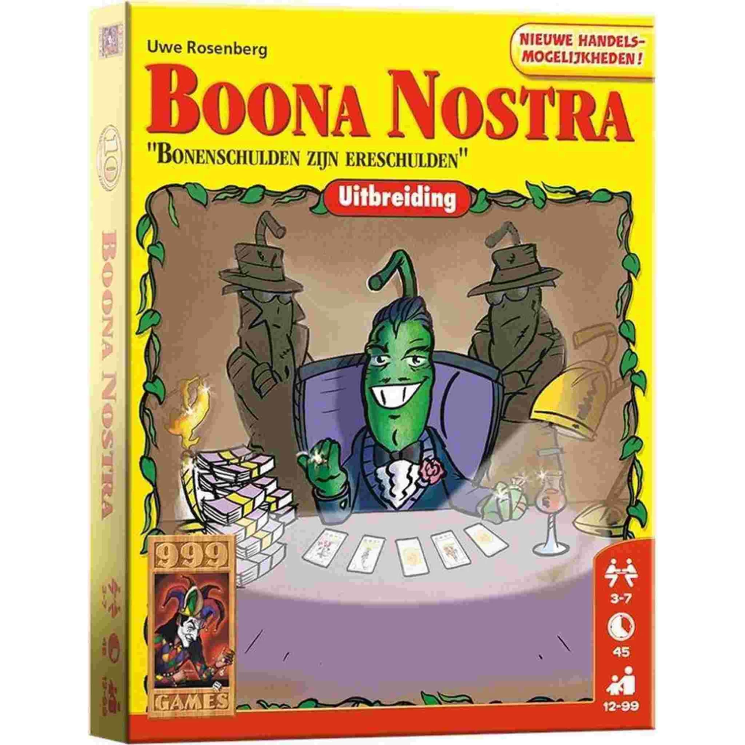 Beschrijving van Boonanza: Boona Nostra – Kaartspel – 999-BOO08 : Afspraak is afspraak en boontje komt om z’n loontje. In deze nieuwe uitbreiding op het bekende kaartspel handel je niet alleen met bonen en bonendollars, maar ook met gunsten. Nieuwe karakters en de bijbehorende gunstkaarten bieden nieuwe handelsopties en breiden de tactische mogelijkheden enorm uit.