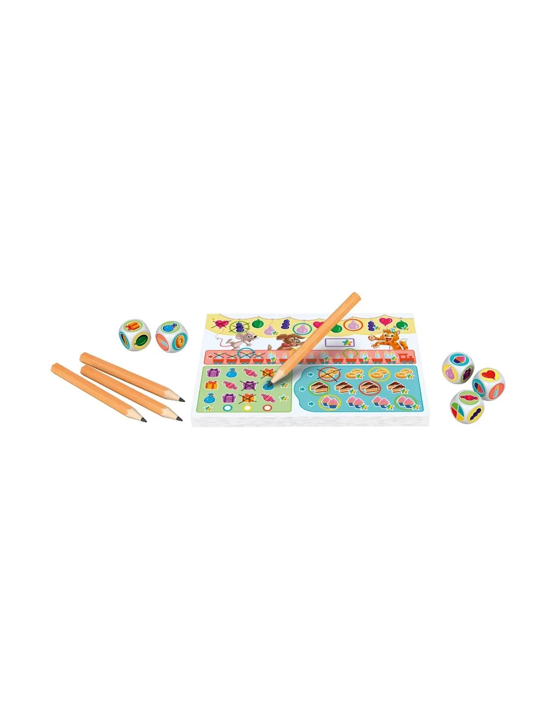 On your turn, roll the five dice. The faces of these dice show a joker symbol or an icon on one of four colored backgrounds. Choose all the dice of one background color, taking any jokers at the same time, then use the symbols on these die faces to mark off items in this colored area of your score sheet:
