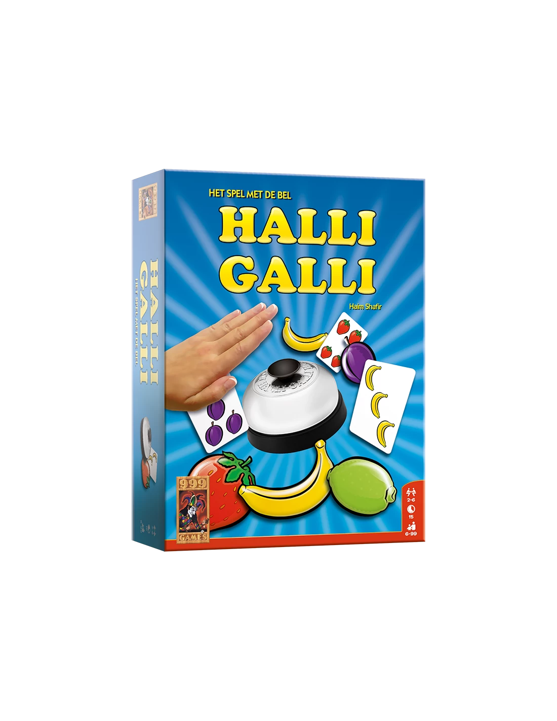 Halli Galli is a speed action game in which players watch for sets of exactly five fruit. The deck contains 56 playing cards showing four kinds of fruit in groups of 1 to 5 and a bell of the type found at hotel reception desks.