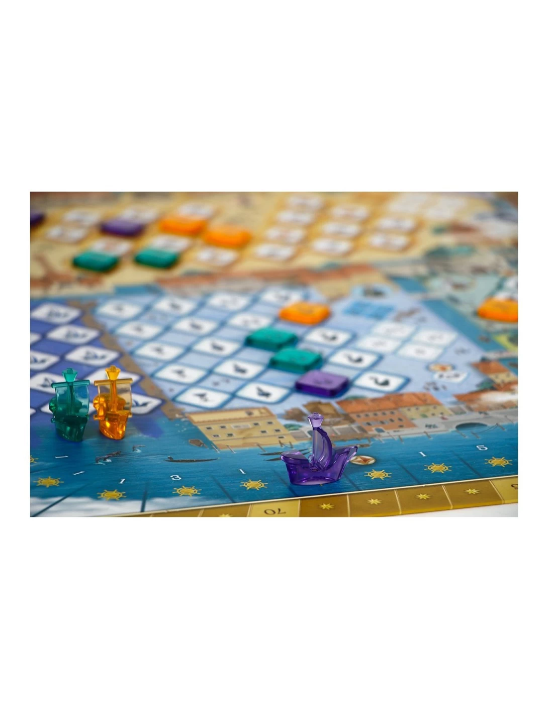 In the Harbor, you move your ship equal to the number on the played card, scoring points based on the space where you land, then place a token in one of the five rows. When that row is filled with three ships, each token in that row scores for its owner 1/3/6/10 points depending on the number of trade goods in that row.