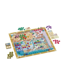 The game board features different aspects of the glass production cycle: workshops where the glass is created, houses where it’s installed, people who support your work, trade shops where it’s sold, and the harbor where ships take the glass to faraway locations. You want to be present in all of these areas, preferably at just the right time to maximize your earnings. The gameboard features 109 spaces, with one card in the deck for each of those spaces.