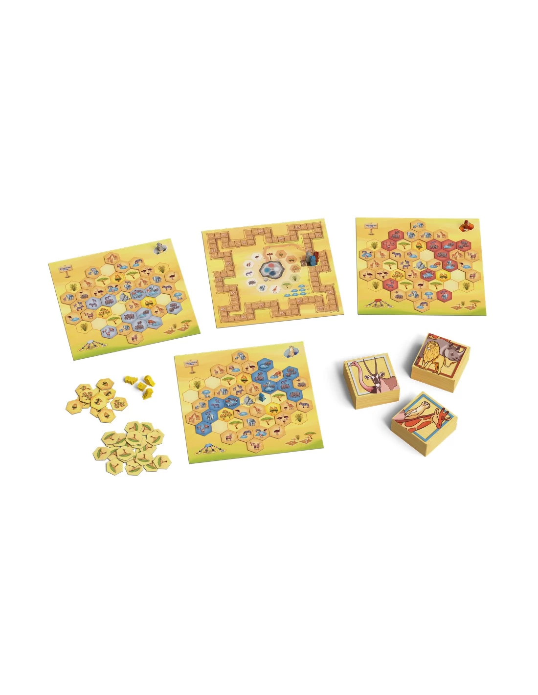 On a turn, you name a specific face-up tile that all players must pick up, flip face down, then move to a different empty space within their own park. Tiles that have been flipped cannot move again, and once all tiles have moved, the game ends with a scoring round. First, tiles adjacent to bush fires are removed if they depict as many animals as the number of fires (1, 2, or 3) on the bush-fire space. Score for each grass and tree uncovered on your board. Finally, score for each of the six animal species; the bigger the main herd of each of species and the more water holes it contains, the more points you score, e.g. a herd of five rhinos and three watering holes is worth (5×3) 15 points. The player with the most points wins.
