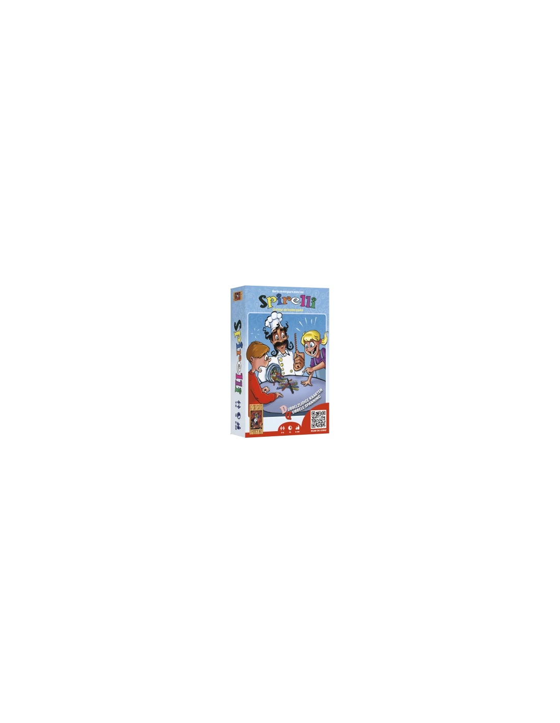 Two cards are visible: one card showing ‘spirelli’ in eight different colours, and another one telling you which ‘spirelli’ you should be looking for: the second from the bottom, the fourth from the top, etc. The first player that comes up with the correct color keeps the spirelli card.